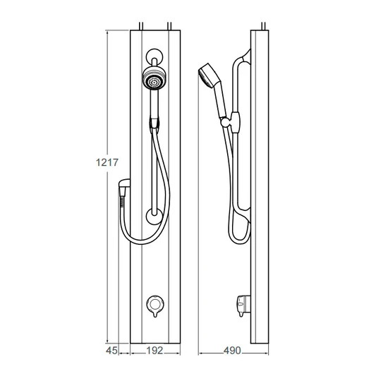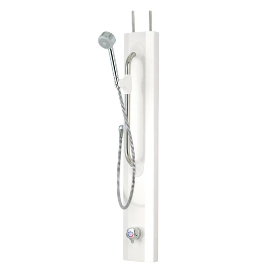 Pre-plumbed shower panel with integral TMV3 approved thermostatic mixing valve with flow and temperature adjustment and with easy clean single spray handset, flexible hose and slide bar.