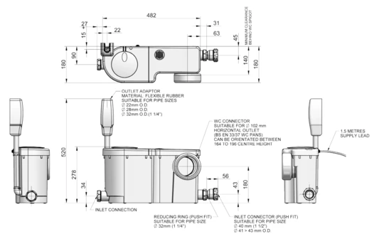 - Extremely quiet macerator. Operates under 60 dB allowing the appliance to be located anywhere.